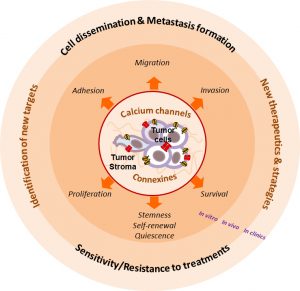 The general objectives of 4CS unit are to better characterize how ion channels and connexins participate to physiological properties and cellular plasticity in stem cells and invasive cells from different organs. We also aim at investigating, how the pathological remodeling of calcium/connexin signaling promote cancer progression and whether their pathological signaling pathways can be targeted to improve cancer treatment.